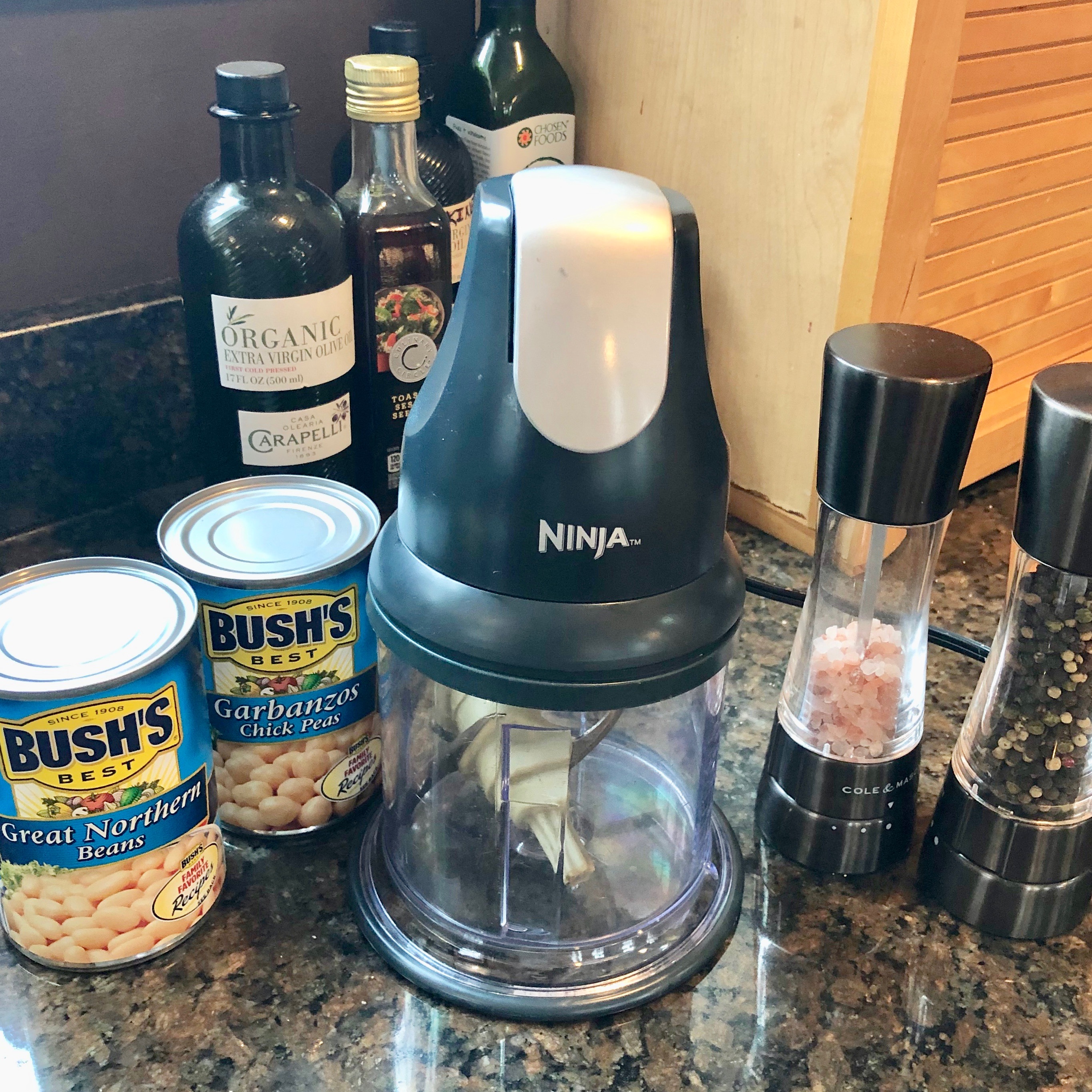 1 – Wash your hands, the processor and the beans in that order. you are on your own to figure the first two. For the beans, use a strainer and rinse in cold running water till there are no bubbles forming as the water rushes over the beans and everything looks clear. if you use Garbanzo/Chick peas, the skin is something you will see washing off from some … which if fine and you can choose to remove all skins if you want … or not. They do add a texture to the finished product … or maybe they don’t depending on how long you pulverize in the Ninja. You choose what to do about the skins. I leave them be personally.