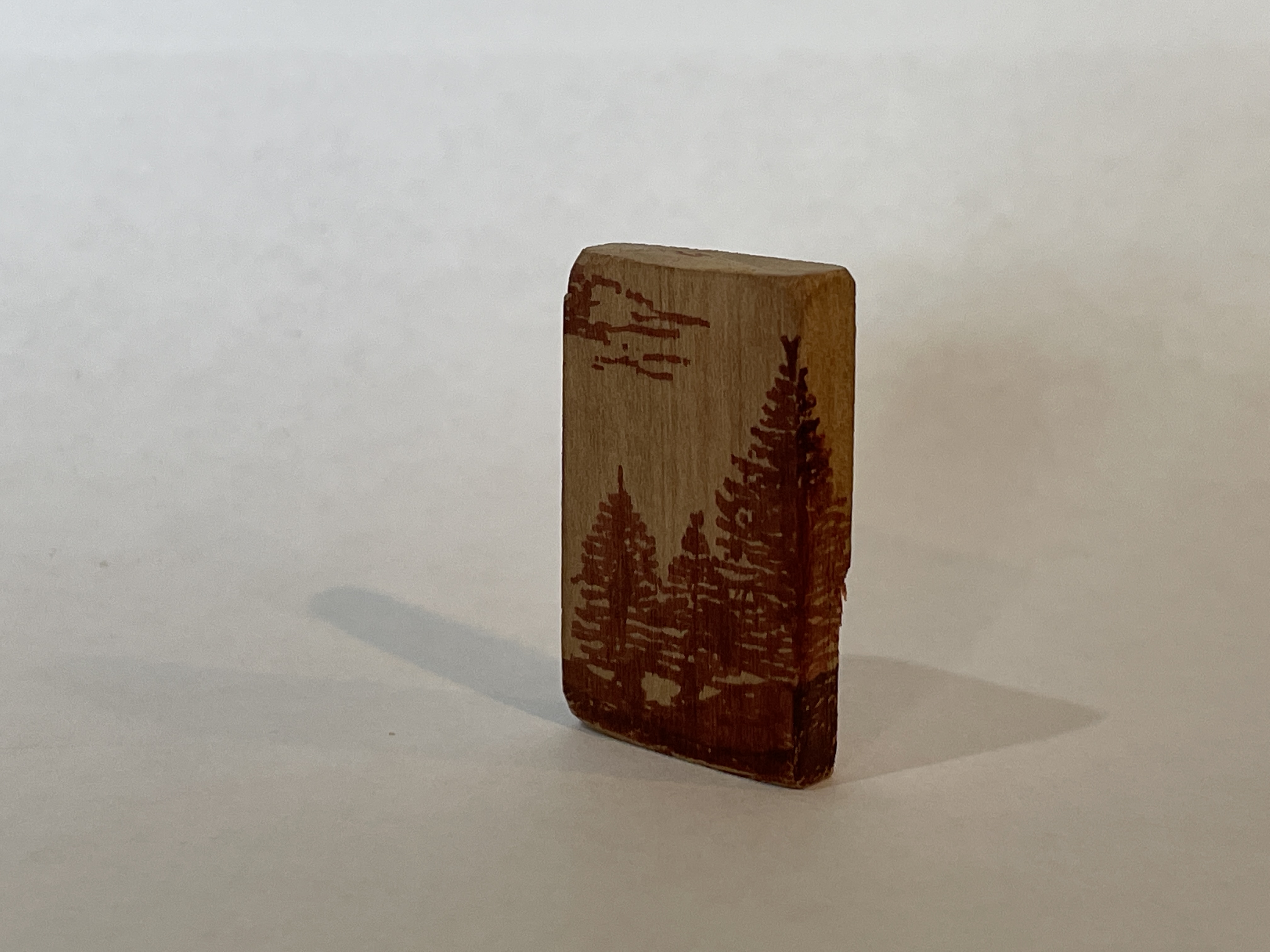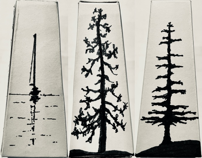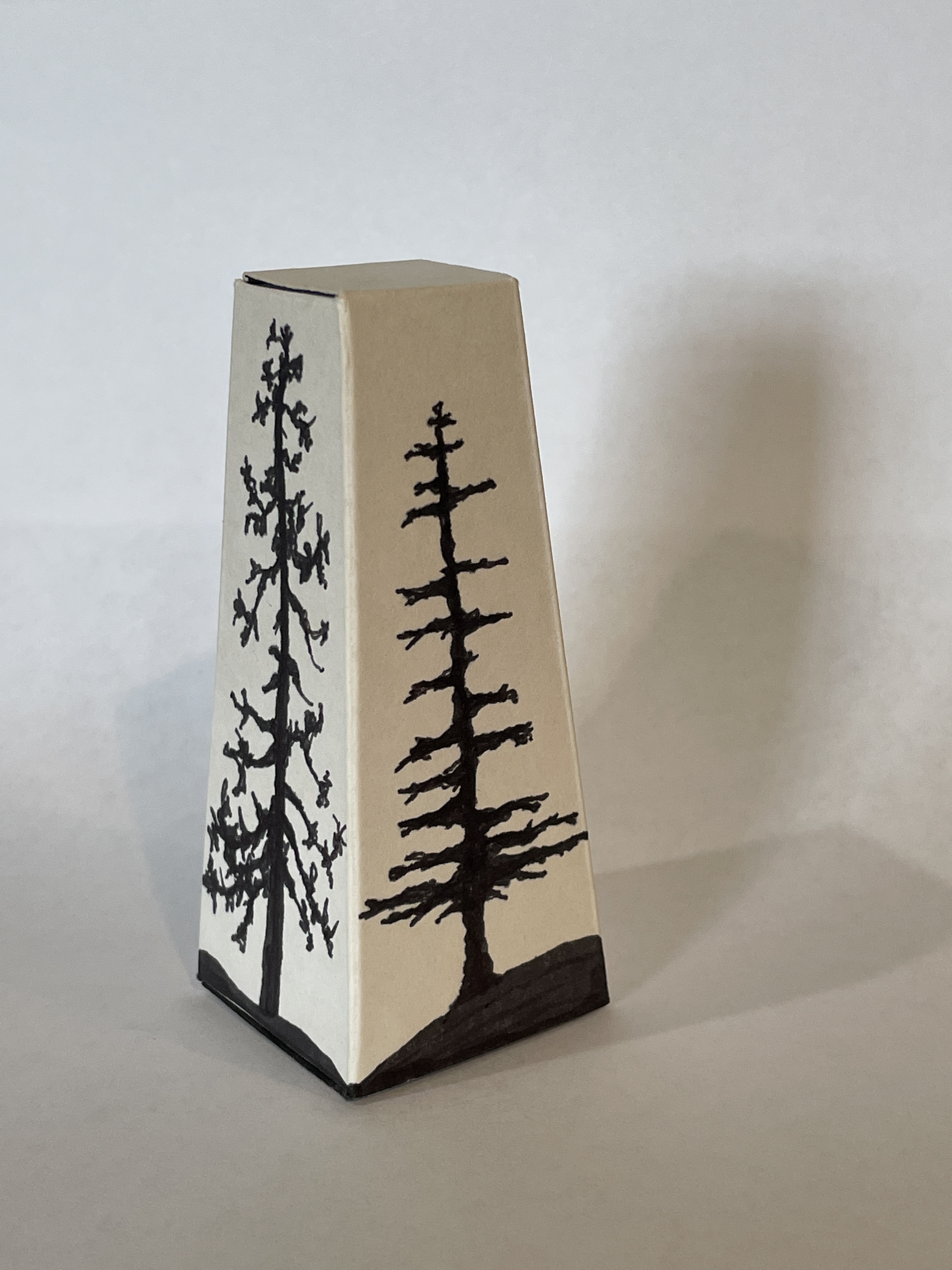 Short Descriptions: 4 sides to the pyramid. One side is the Sail Boat, one side is the pine, one side is the tall tree and the final side is blank.